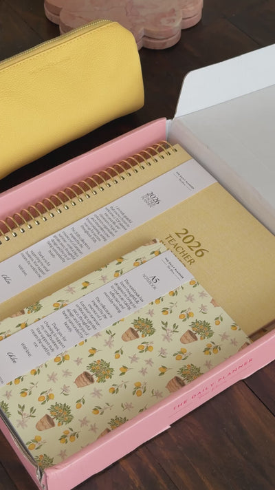 The 2026 Weekly Teacher Planner in Lemon Buttercream features a buttery yellow cover inspired by sunlit citrus groves and the sweet comfort of freshly baked lemon treats. With a spacious weekly layout spread across two pages, goal-setting prompts and ample space for student records, this planner is thoughtfully designed to support both primary and high school teachers. Aligned with Australian school terms, it offers the flexibility to personalise your week, helping you stay organised, focused and inspired throughout the school year.